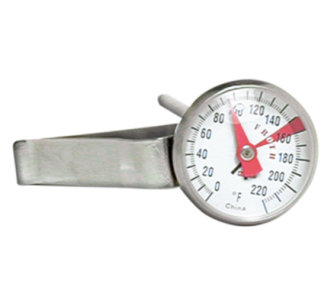 Frothing Thermometer, 0 to 220° F, 5" stem, 1" dia. dial, 5-1/4" long., instant reading, adjustable clip, stainless steel probe, NSF, HACCP (Do not leave in microwave or oven while cooking) blister packed