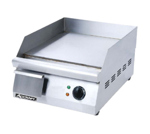 Griddle, countertop, electric, 15-1/2" x 16" flat griddle surface, temperature control from 120°F to 570°F, bottom mounted grease collection pan, 3" sides & backsplash, stainless steel construction, 120v/60/1-ph, 1750 watt, 14.5 amps, NEMA 5-15P, NSF, CE