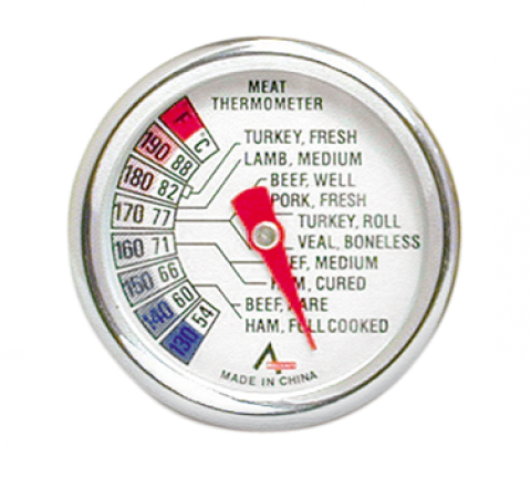 Meat Thermometer, 2" dia. dial, 130° to 190°F and 54° to 87°C, 4" heavy-duty metal stem, cooked temperature chart, stainless steel, NSF, HACCP, (LEAVE IN WHILE COOKING) blister packed