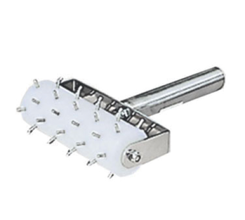 Dough Roller Docker, 5" wide barrel, 3/8" stainless pins embedded in a 1-3/4" plastic barrel, stainless steel handle, axle and frame