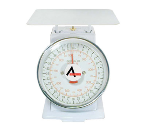 Portion Control Scale, dial type, 2 lbs x .01 lbs. (32 oz. x 1/4 oz.) capacity, 7-7/8" square stainless steel platform, top loading counter model, dual read: U.S. and metric measurements, white