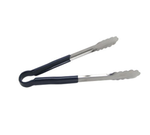 Utility Tongs, 10", one-piece, scalloped edge, poly-coated color handle, heavy-duty stainless steel, blue
