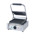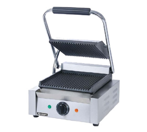 Sandwich Grill, single, countertop, electric, 8-1/2" x 9-1/4" grill surface, cast iron grooved plates, adjustable thermostat control switch 120°F to 570°F, includes oil tray & cleaning brush, stainless steel, 120v/60/1-ph, 1750 watts, 14.5 amps, NEMA 5-15P, NSF, CE