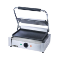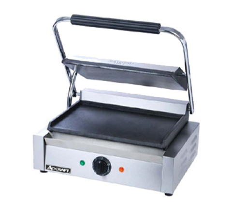 Panini Grill, single, countertop, electric, 13-1/4" x 9-1/4" grill surface, cast iron smooth plates, adjustable thermostat control switch 120°F to 570°F, includes oil tray & cleaning brush, stainless steel, 120v/60/1-ph, 1750 watts, 14.5 amps, NEMA 5-15P, NSF, CE