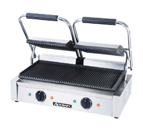 Sandwich Grill, double, countertop, electric, 19" x 9-1/4" grill surface, cast iron grooved plates, adjustable thermostat control switch 120°F to 570°F, includes oil tray & cleaning brush, stainless steel, 120v/60/1-ph, 1750 watts, 14.5 amps, NEMA 5-15P, NSF, CE