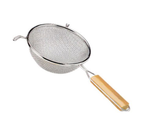 Mesh Strainer, 10" diameter, single mesh, pan hooks, hardwood inset in handle, tinned steel