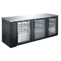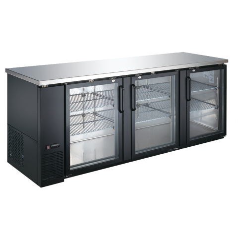 U-STAR Back Bar Bottle Cooler, 90"W x 27-3/4"D, 32.0 cu.ft., 304 stainless steel countertop, (3) hinged glass doors with locks, side mount self-contained refrigeration, automatic defrosting, (6) adjustable plastic coated wire shelves, LED interior lighting, holds (4) half barrel kegs, (152) 6-packs/12 oz. cans or (165) 6-packs/12 oz. bottles, 304 stainless steel interior floor and walls with black coated steel exterior, R290, 115v/60/1-ph, 4.7 amps, 1/4 HP, 7' cord, NEMA 5-15P, cETLus, ETL-Sanitation