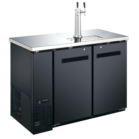 U-STAR Draft Beer Cooler/Dispenser, 48-3/4"W x 24-1/2"D x 51-1/2"H (including tap tower), 12 cu.ft., side mounted compressor, (2) hinged doors with recessed handles & locks, (1) stainless steel tap tower with 2 taps and stainless steel drip tray, stainless steel countertop, (2) adjustable plastic coated wire shelves, holds (2) half barrel kegs, stainless steel interior, laminated black vinyl front and sides, R290, 115v/60/1-ph, 3 amps, 1/5 HP compressor, 7' cord, NEMA 5-15P, cETLus, ETL-Sanitation (special order, container buy only) (contact factory for price)
