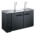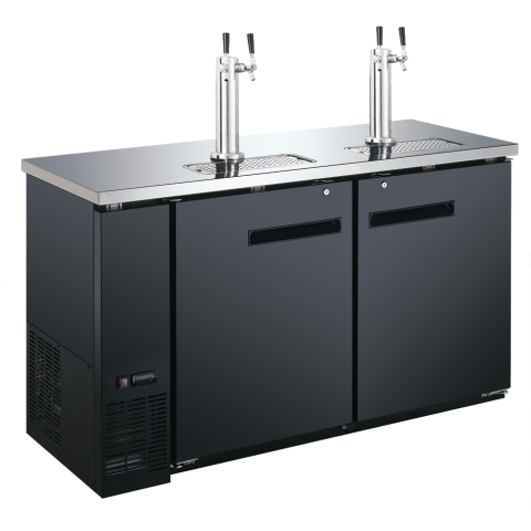 U-STAR Draft Beer Cooler/Dispenser, 60-3/4"W x 24-1/2"D x 51-1/2"H (including tap tower), 16 cu.ft., side mounted compressor, (2) hinged doors with recessed handles & locks, (2) stainless steel tap towers with 2 taps per tower and stainless steel drip tray, stainless steel countertop, (2) adjustable plastic coated wire shelves, holds (2) half barrel kegs, stainless steel interior, laminated black vinyl front and sides, R290, 115v/60/1-ph, 3 amps, 1/5 HP compressor, 7' cord, NEMA 5-15P, cETLus, ETL-Sanitation (special order, container buy only) (contact factory for price)