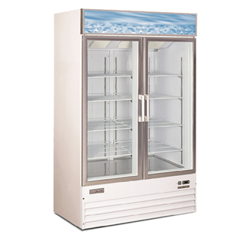 U-STAR Freezer Merchandiser, 49" wide, two-section, 27.0 cu. ft., bottom mounted self-contained refrigeration, anti-fogging hinged self-closing doors, illuminated interior, front-mounted LED temperature display, (8) adjustable plastic coated steel shelves, removable door gasket, automatic defrosting, painted aluminum interior with stainless steel floor, white coated steel exterior, 115v/60/1-ph, 15.0 amps, 1 HP, 7' cord & NEMA 5-15P, cETLus (special order, container buy only, contact factory for price)