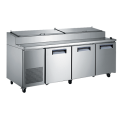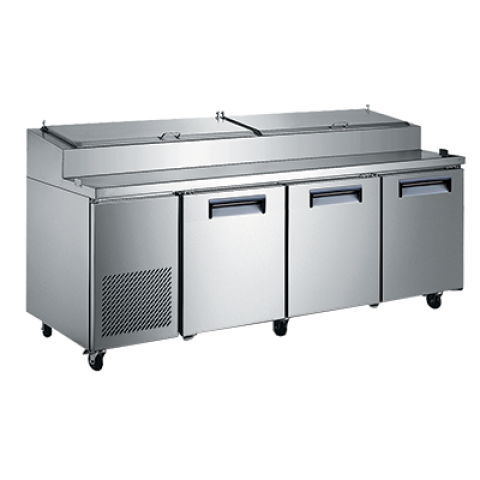 U-STAR Refrigerated Pizza Prep Table, 92"W, 3-section, 24.0 cu.ft., side mounted self-contained refrigeration, (3) doors with recessed handles, insulated oversized hinged lid, digital temperature controller with LED display, automatic defrosting, (3) plastic coated wire shelves, removable door gasket, 19" deep x 3/4" thick polyethylene cutting board, includes (12) 1/3 pans, 430 stainless steel exterior, 304 stainless steel interior, (4) 4" casters, 115v/60/1-ph, 6.6 amps, 1/4 HP, 7' cord, NEMA 5-15P, cETLus, ETL-Sanitation