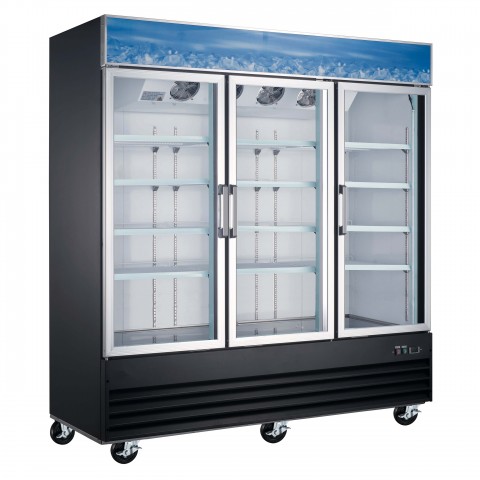 U-STAR Refrigerated Merchandiser, 3-section, 78-1/4"W x 30"D x 80-3/4"H, 69 cu.ft., (3) hinged swing glass doors, (12) adjustable plastic-coated shelves, interior lighting, 33°F to 41°F temperature range, LED temperature display, painted aluminum interior with a stainless steel floor, black coated exterior, bottom-mounted self-contained refrigeration, R290 refrigerant, 3/4 HP, 115v/60/1-ph, 10.7 amps, NEMA 5-15P, cETLus, ETL-Sanitation (special order, container buy only) (contact factory for price)