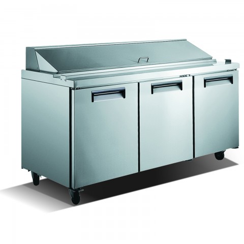 U-STAR Salad/Sandwich Refrigerated Prep Table, 71"W, 3-section, 18 cu.ft., rear mounted self-contained refrigeration, (3) doors with recessed handles, insulated hinged lid, digital temperature controller with LED display, automatic defrosting, (3) plastic coated wire shelves, 3/4" thick removable polyethylene cutting board, removable door gasket, includes (18) 1/6 pans, 430 stainless steel exterior, 304 stainless steel interior, (4) 4" casters, 115v/60/1-ph, 8.4 amps, 3/4 HP, 7' cord, NEMA 5-15P, cETLus, ETL-Sanitation (special order, container buy only) (contact factory for price)