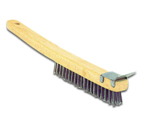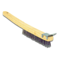 Wire Brush, 14" long, with metal end scraper, hanging hole, tempered steel wire bristles, hardwood handle
