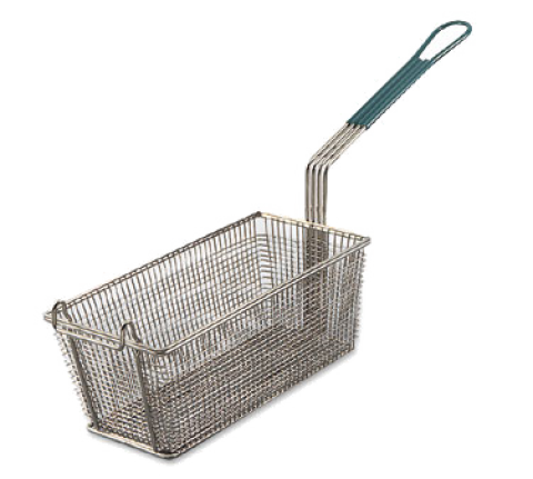 Optima® Fryer Basket, 13" x 5-3/8" x 5-5/8", rectangular, front hook, wire mesh, green plastic handle
