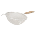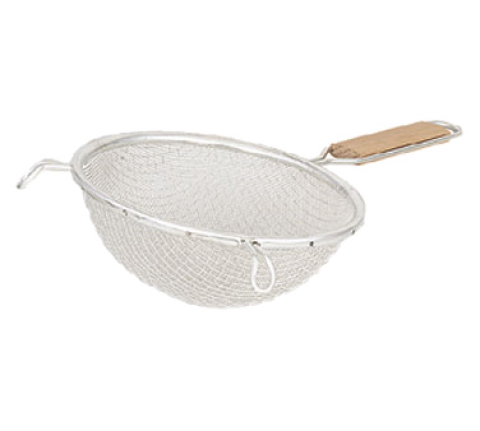 Strainer, 10-1/4" bowl, 9"L handle, pan hook & flat-bottom lacquered wood handle, rigid strainers are retinned, medium double mesh