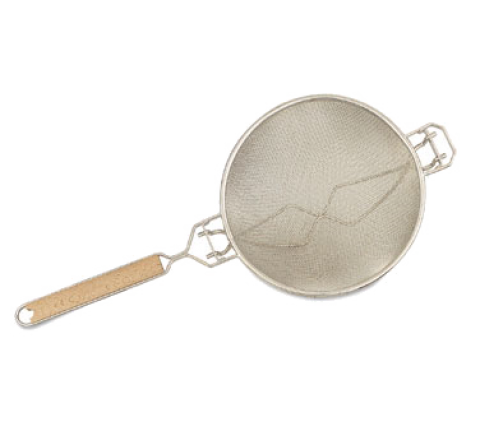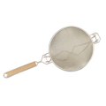 Strainer, 9" bowl, 9"L handle, pan hook & flat-bottom wood handle, rigid tinned, medium double mesh