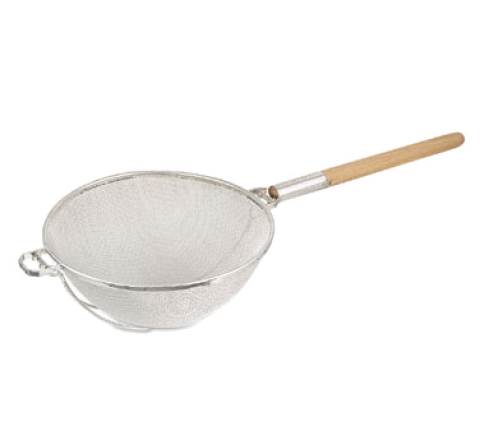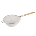 Strainer, 14" bowl, 17"L handle, pan hook & flat-bottom wood handle, rigid tinned, medium double mesh
