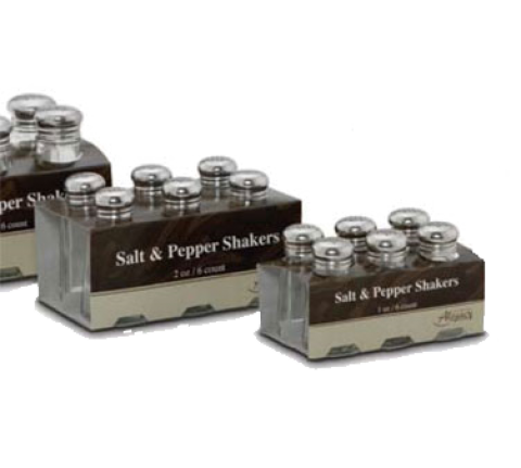 Cash & Carry Salt & Pepper Shaker, 1 oz., paneled glass jar, mushroom shaped universal hole tops, stainless steel, shrink wrapped (6 each per pack) (minimum order = 1 dozen)