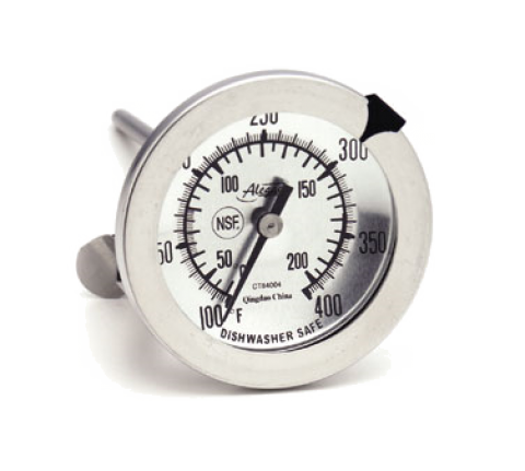 Thermometer, candy/jelly/deep fry, 2-1/4" dial, mercury filled glass tube, 12" L, temperature range 100 to 400° F (40 to 200° C), adjustable container clip, dishwasher safe, 304 stainless steel with heat-resistant handle, NSF (item may be prohibited in certain U.S. states)