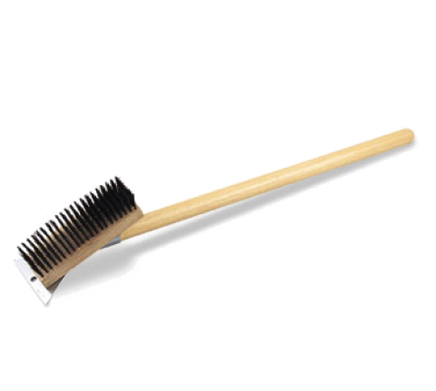 Grill Brush with Scraper, 7-1/4" x 2-1/2" block, 27" handle parallel to brush, flexible steel wire bristles
