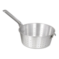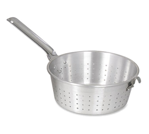 Strainer, 9" dia. x 3-1/2" deep, round, grooved riveted handle, dent-resistant, pan hook, aluminum