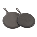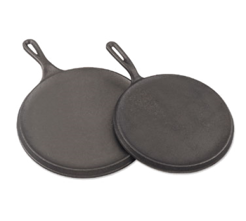 Griddle, 10-1/4" dia. x 1/4" deep, round, with handle, hanging hole, cast iron, black