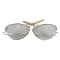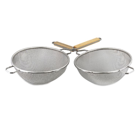 Strainer, 6-1/4" bowl, 12-1/2" overall length, double pan hook, flat-bottom wood handle, stainless steel, medium double mesh