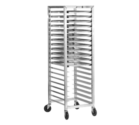 Bun Pan Rack, Mobile, heavy duty, 72"H, open sides, 2" slide spacing, capacity (30) 18" x 26" bun pans, all welded aluminum construction, end loading, 5" dia. swivel casters, 1200 lb. load capacity, shipped fully assembled, NSF