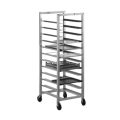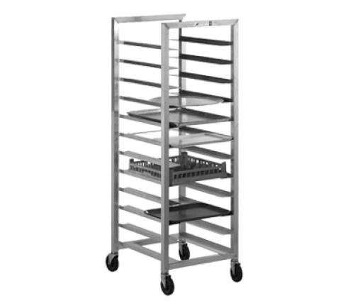 Universal Open Rack, Mobile, heavy duty, 73"H, 5" slide spacing, holds 18"x26"bun pans, 20" x 24" trays, 12" x 20" x 2-1/2" or 4" deep pans, 12 tray capacity, all welded aluminum construction, end loading, 5" diameter swivel casters, 1200 lb capacity, shipped fully assembled, NSF