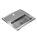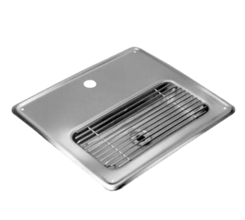 Water Station, 10-1/2" x 12-1/2", 4-1/2" x 10" x 1" deep drainage area, drainage area is 2-3/4" from riser hole, 7/8" dia. hole for glass filler shank, 1-1/4" OD x 4" long drain tailpiece, stainless steel, T&S Brass