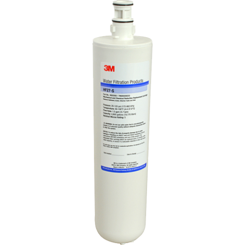 Water Filter Cartridge, high flow beverage, 14" x 3", 4800 gallon capacity, 1.5gpm, 25-125psi/172-862 KPA, 5 micron filtration, 40° to 100° F temperature range, (2) O-rings, sediment, scale, chlorine taste/odor, white, plastic cartridge housing, (HF27-S), 3M®