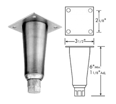 Leg, equipment, 3-1/2", 6" min., 1-1/8" adjustable, removable mounting plate, zinc die cast, satin nickel finish