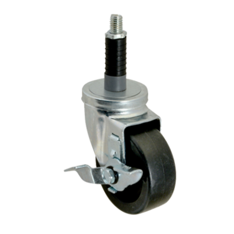 Caster, swivel stem, medium duty, 1-1/4"W, 3-1/2" dia., delrin Bearing, for 1" OD tubing, black rubber wheel with plastic hub & brake