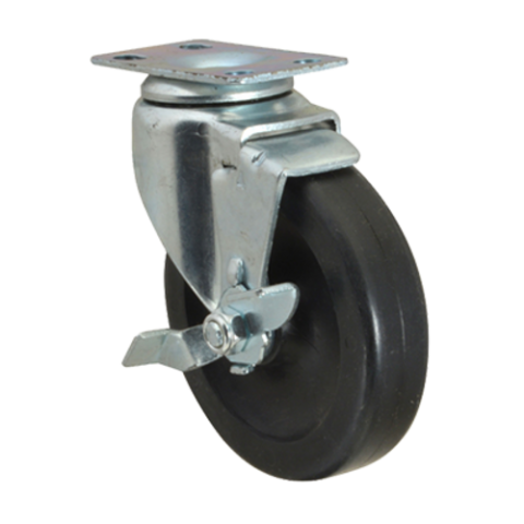 Caster, swivel plate with brake, standard duty, 4" dia., Ball Bearing, black rubber wheel