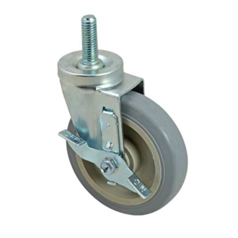 Caster, threaded stem with brake, medium duty, 5" dia., 5/8-11 thread, Ball Bearing, swivel, gray polyurethane wheel with plastic hub