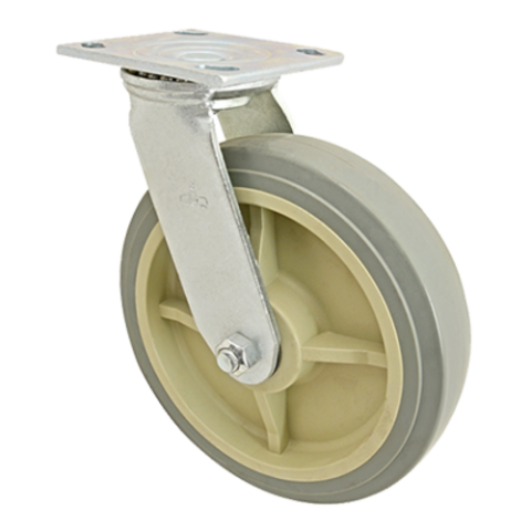 Caster, plate, heavy duty, 2"W, 8" dia., Ball Bearing, swivel, non-marking plastic wheel with gray polyurethane tire