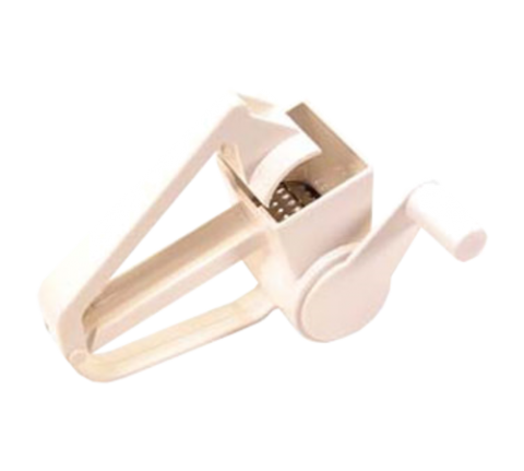 Hand-Crank Cheese Grater, 6" overall length with 2" stainless steel grating wheel, can be disassembled for cleaning, dishwasher safe, plastic housing, white