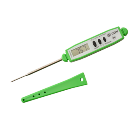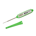 Thermometer, digital, green, 2-3/4" stem, 6-1/4" overall length, -40° to 450° F (-40° to 230° C) temperature range, 1.5v battery, pocket clip, hook, water proof, antimicrobial, food safe, field calibration, shatterproof, plastic, stainless steel stem, NSF