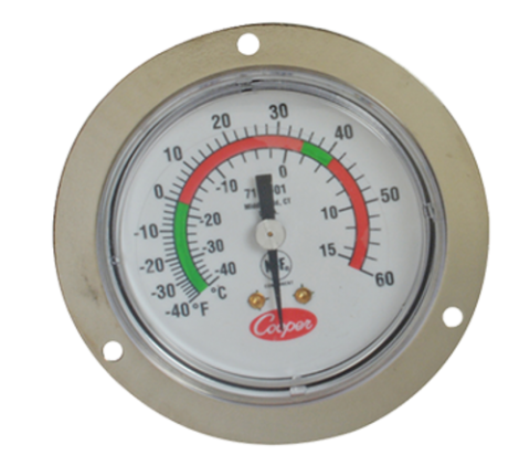 Thermometer, panel, refrigerator/freezer, 48" capillary, 2-1/2" x 5/16" bulb, 2-3/4" dial, 3-7/16" flange, -40° to 60° F temperature range, stainless steel housing, NSF