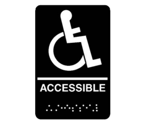 Sign, "Wheelchair Accessible", 6" x 9", raised braille symbols & lettering, black with white letters, plastic with adhesive back