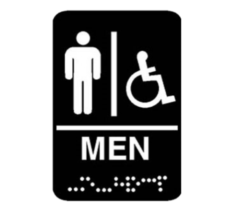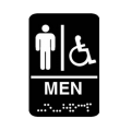 Sign, "Men/Wheelchair restroom", 6" x 9", raised braille symbols & lettering, black with white letters, plastic with adhesive back