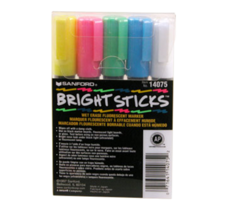 Wet Erase Markers, for use on black marker boards, fluorescent light boards or glass, rain proof, 5 colors per box, bright pink, bright blue, bright yellow, bright green, bright white