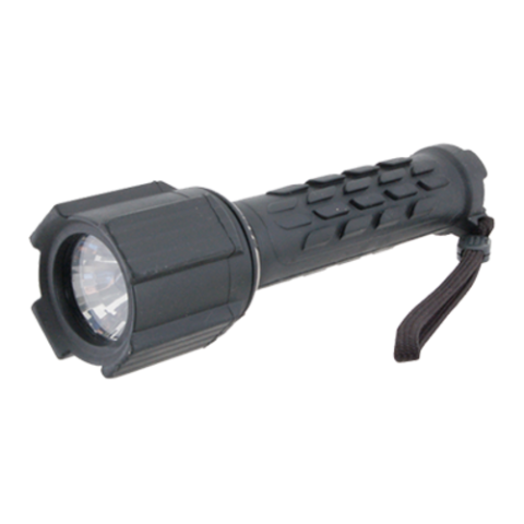 Flashlight, 8-3/8"L x 2-3/8" dia., krypton bulb, (2) D Batteries required (not included), rubber casing with strap