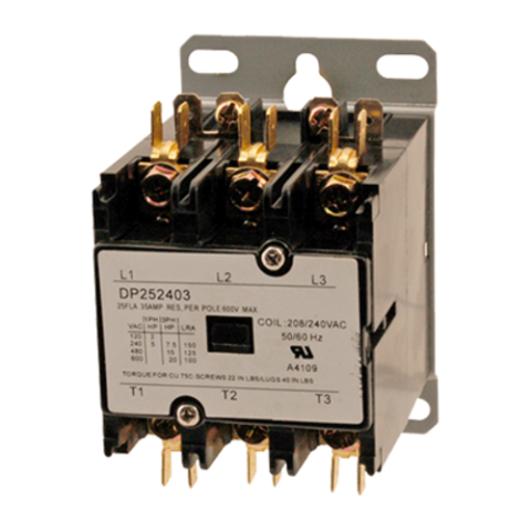 Contactor, 3 pole, full load/25 amp, resistance load/35 amp, 208/240v