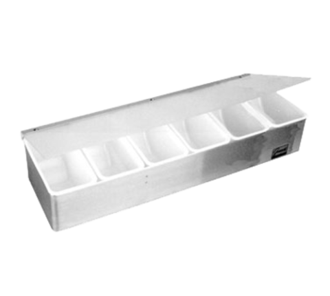Condiment Dispenser, 18-1/8" x 5-3/4" x 3-1/2" H, (6) 1 pint inserts, plex lid, stainless steel construction