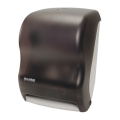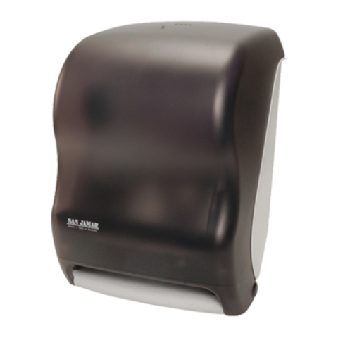 San Jamar® Tear-N-Dry™ Automatic Towel Dispenser, 11" x 9" x 15-1/2" H, for 8" wide paper rolls, touchless, pre-set to deliver 10" length of towel, includes key, plastic, translucent black pearl, requires (4) D cell batteries (not included)