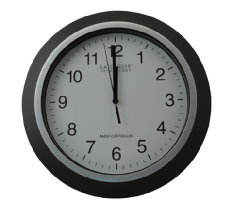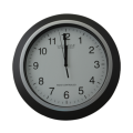 Atomic Wall Clock, 12" dia. approx., white face with black numerals, black plastic frame, requires (1) AAA battery (not included), Montros
