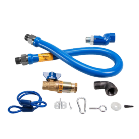 Dormont® Gas Connector Kit, 60"L x 1" fittings, includes heavy duty gas hose, restraining device, swivel max, hardware, safety quick disconnect, street elbow, stainless steel tubing, blue plastic coated hose