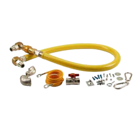 Gas Hose Connector Kit, 3/4" x 48", includes: 3/4" NPT ball valve, hardware, 3/4" NPT reducing elbow, restraining cable, & 90% reducing elbow with 3/4 / 1/2" NPT, T&S Brass